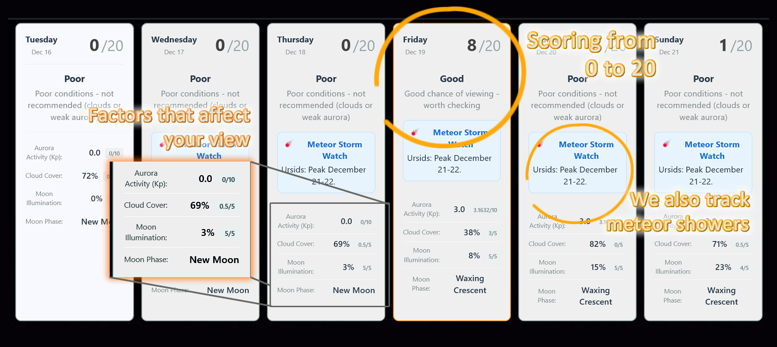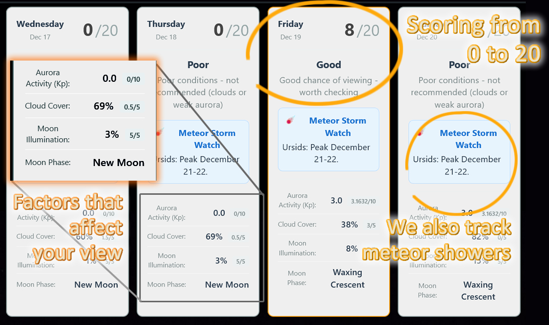 The Aurora Hunter Pro plan gives subscribers a 7 day forecast for the best combination of aurora activity, weather and moon phase.